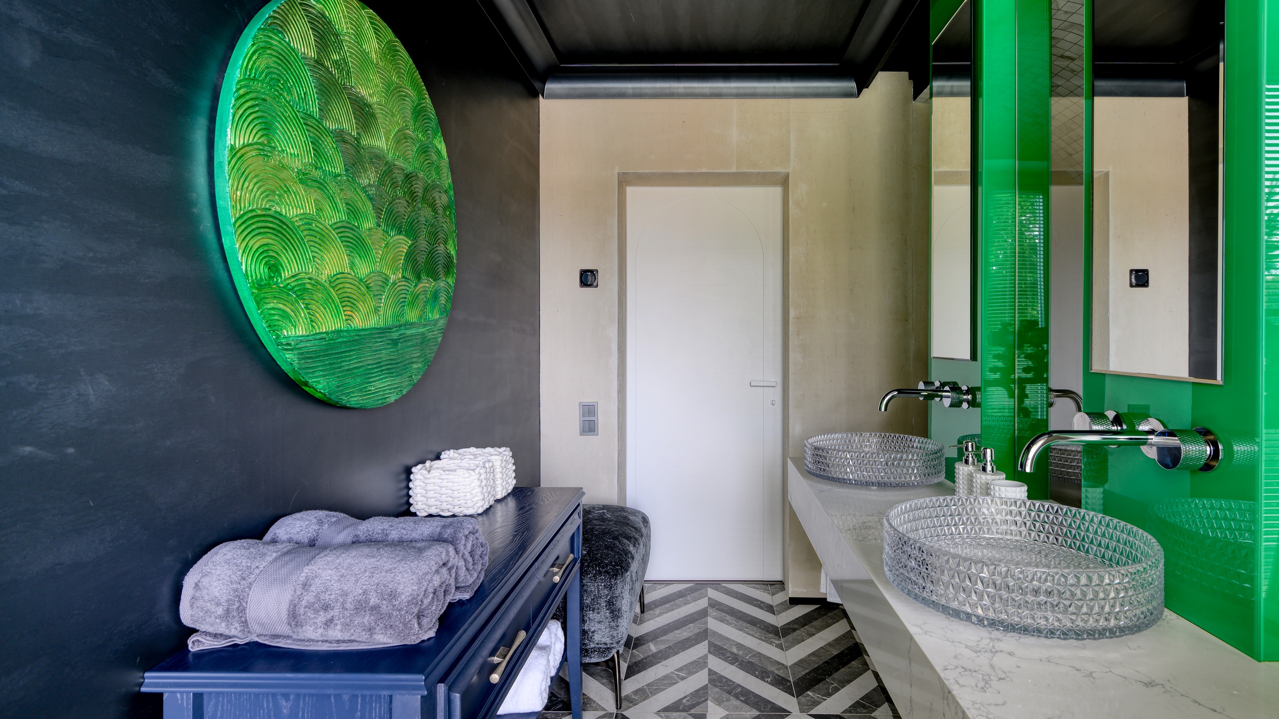 Контрасты фактур, сочетание блеска стекла и природной текстуры камня создают ощущение современного арт-пространства, где дизайн становится эмоцией, а материал — инструментом для её выражения.