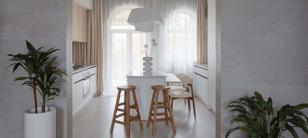 Дизайнер Евгения Матвеенко выбрала наш керамогранит для оформления кухни-гостиной для семьи с особенным ребенком. Пространство организовано таким образом, чтобы мальчик мог с комфортом исследовать мир доступными ему способами, поэтому кухня-гостиная сделана антивандальной, с керамогранитом из коллекции Магмас на стенах, который идеально вписался в оформление инклюзивного интерьера — функционального и в то же время эстетичного.