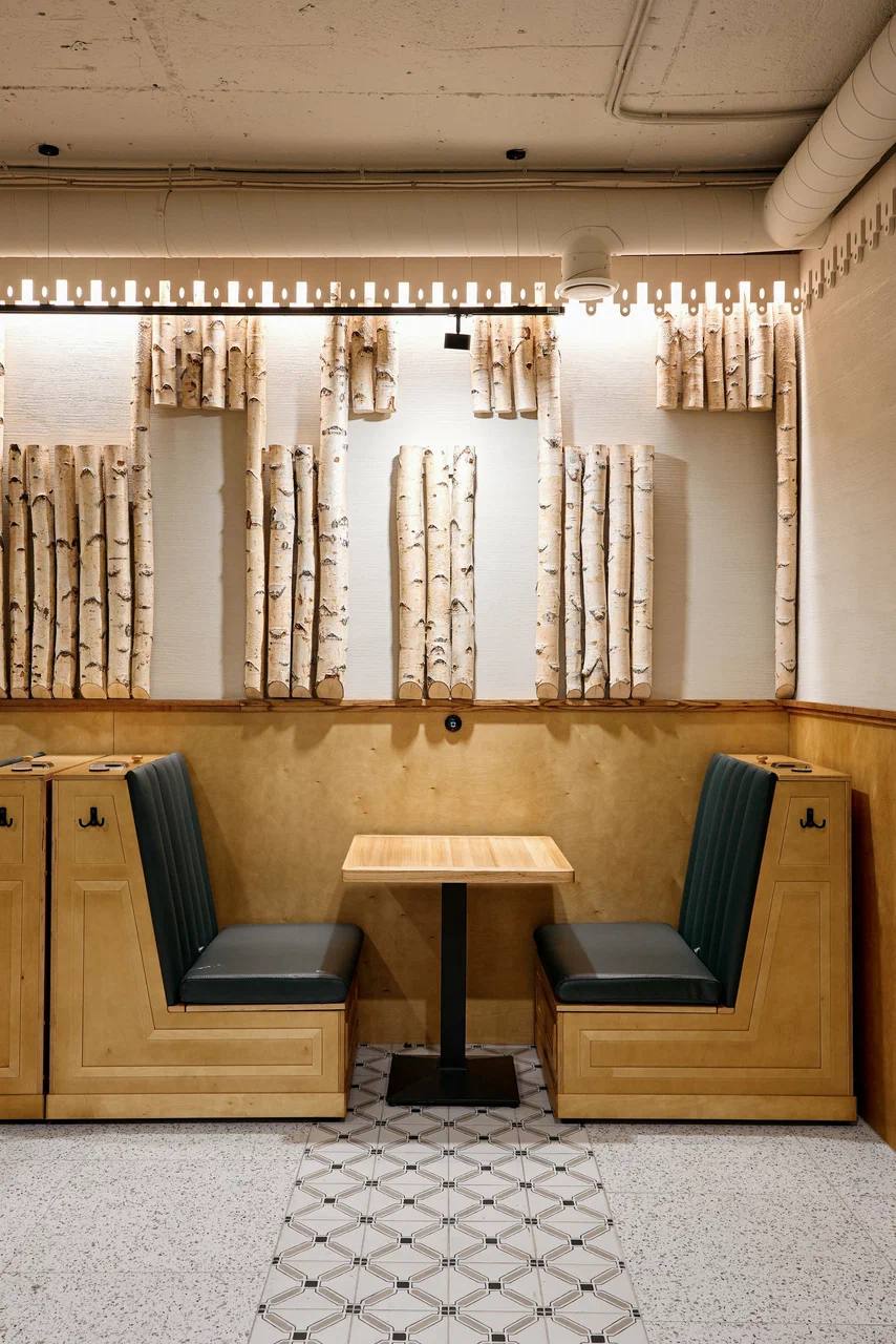 Акцентным элементом стали вертикальные панели из берёзовых ветвей, отсылающие к классической банной культуре. Пол выполнен из керамогранита Космос с текстурой мелкого терраццо, а декоративные дорожки из плитки с геометрическим узором формируют выразительное зонирование пространства.