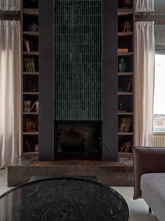 • Центром притяжения гостиной стал камин. Его оформили эффектным черным керамогранитом Нолана 80х160. Глубокий цвет и выразительная поверхность подчеркивают геометрию каминной зоны и добавляют интерьеру характер.