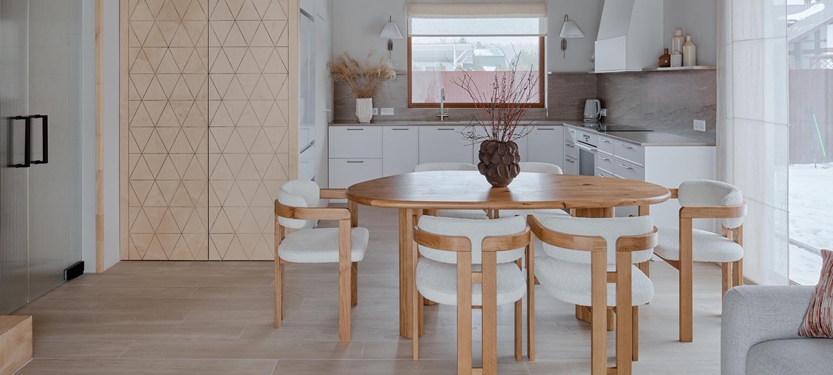 Материал, передающий естественную красоту древесины, помог создать теплую и уютную атмосферу. Дизайнер проекта Дарья Колобова дополнила пространство предметами, отражающими любовь хозяев к путешествиям по России.